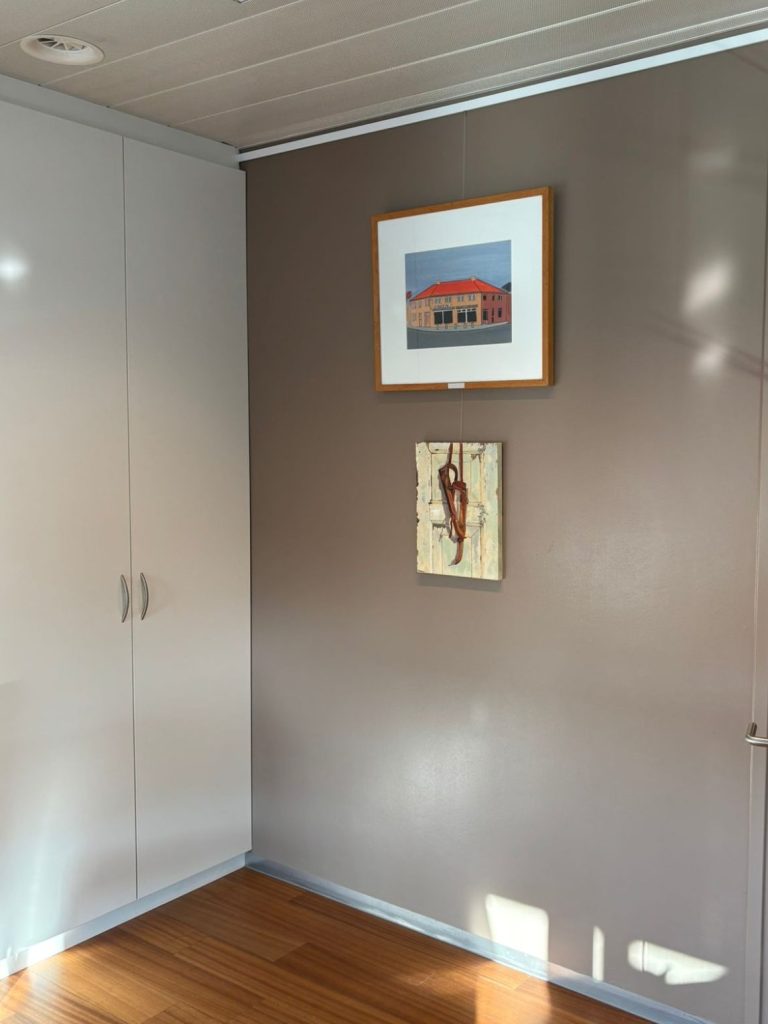 Er zijn verschillende schilderijen geëxposeerd, die variëren in techniek en formaat.